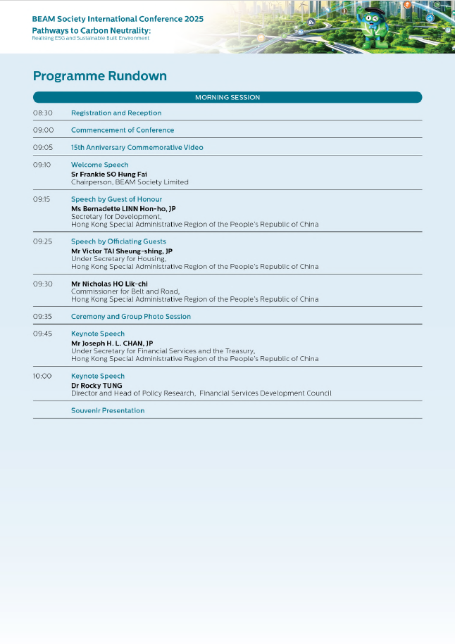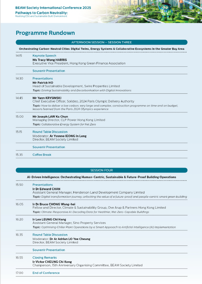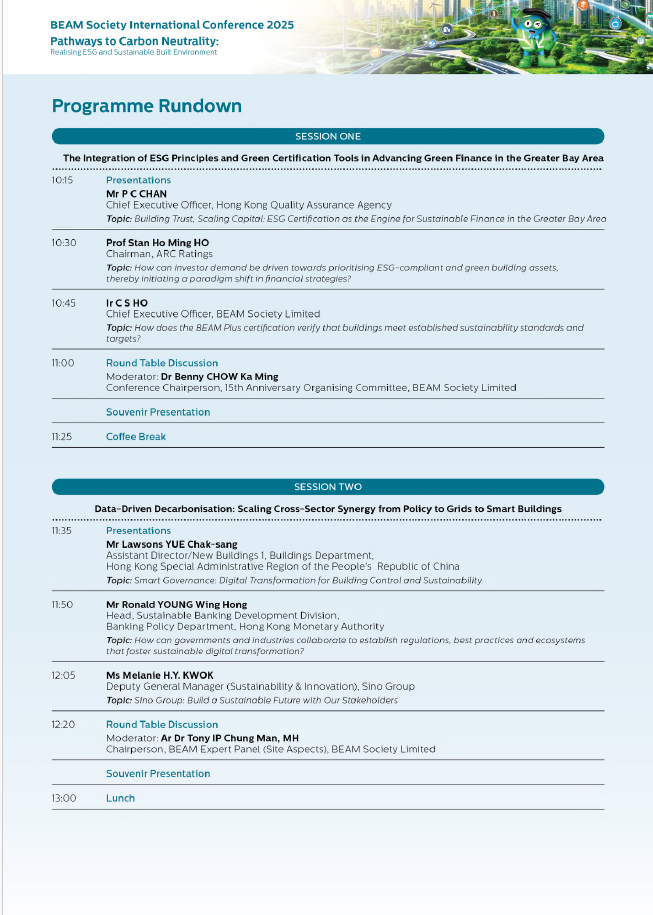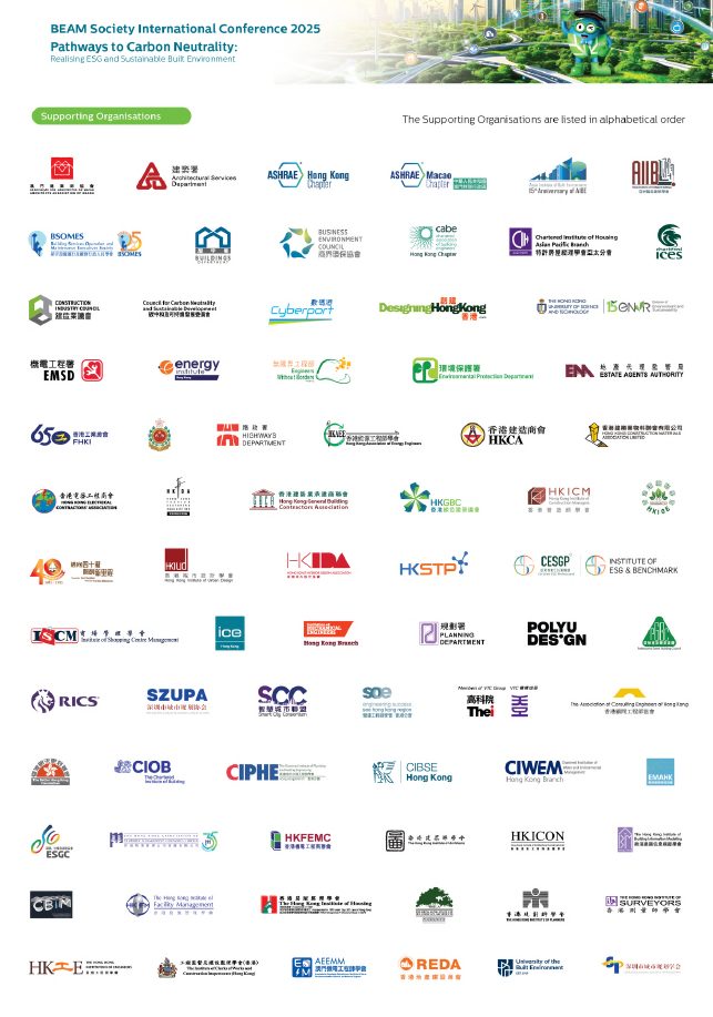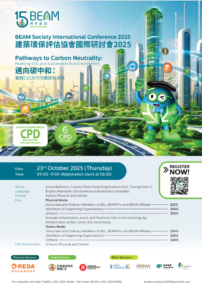 Heading to its 15th Anniversary, BEAM Society Limited (BSL) is commemorating this notable milestone by organising the BEAM Society International Conference 2025, which serves as a key platform to promote sustainable development practices and investment strategies. Themed “Pathways to Carbon Neutrality: Realising ESG and Sustainable Built Environment!”, the Conference will deliberate on the Environmental, Social, and Governance (ESG) implementations, including discussions on green finance advancement, digital transformation, artificial intelligence for building life cycle, and green assessment tools and certification. Remarkable green advocates and academics will share international case studies, further advancing our mission to creating a more sustainable built environment for the community and achieving the carbon neutrality goal set out in Hong Kong's Climate Action Plan 2050. The Conference will definitely facilitate the connectivity and deepen collaborations across the Greater Bay Area region, creating synergies that align with the Mainland’s shared sustainability objectives. These efforts are fully aligned with the goals outlined in the Chief Executive’s Policy Address 2024.