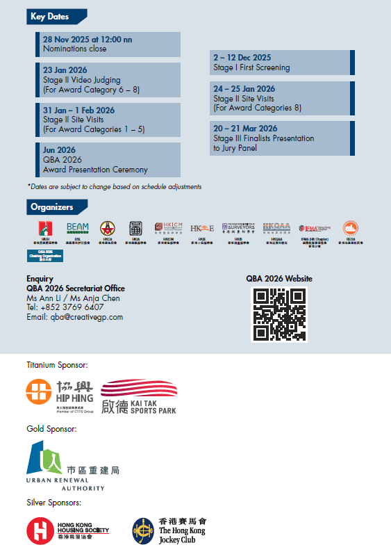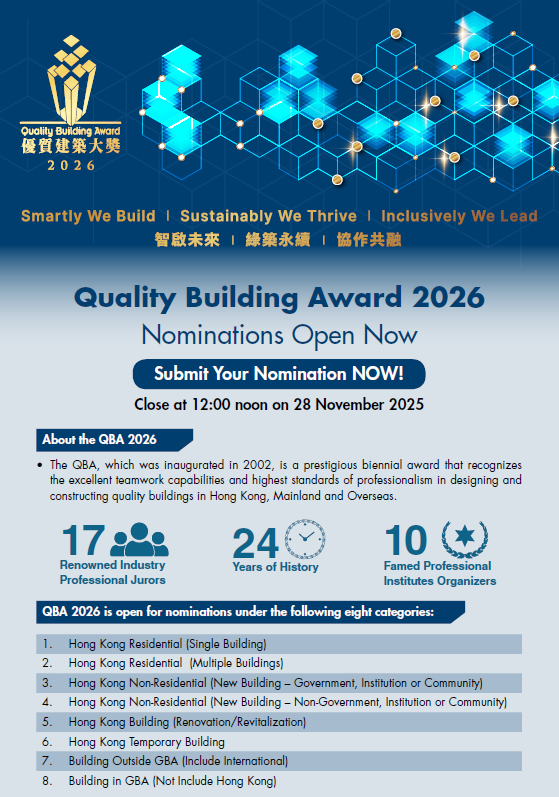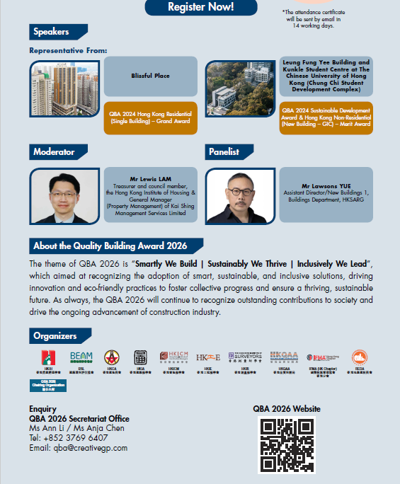 Quality Building Award (QBA) cordially invites you to attend the pre-award seminar series of QBA 2026. With the theme of “Building Joyful Communities: Where Diversity Becomes Strength”, the second seminar will emphasize the positive impact of diversity on community development and the importance of creating joyful, inclusive environments. We encourage your participation in this seminar to gain valuable insights into fostering inclusive and vibrant communities.