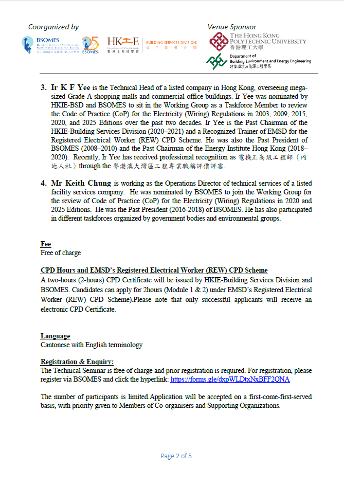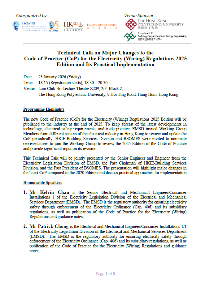 BSOMES are planning to organize a seminar - Major Changes to the Code of Practice (CoP) for the Electricity (Wiring) Regulations 2025 Edition and Its Practical Implementation
