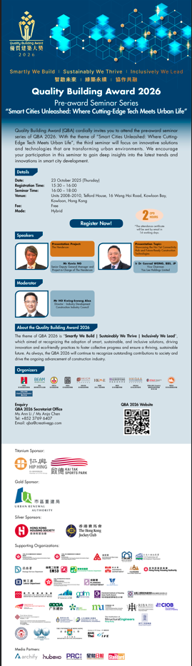 Quality Building Award (QBA) cordially invites you to attend the pre-award seminar series of QBA 2026. With the theme of "Smart Cities Unleashed: Where Cutting-Edge Tech Meets Urban Life", the third seminar will focus on innovative solutions and technologies that are transforming urban environments. We encourage your participation in this seminar to gain deep insights into the latest trends and innovations in smart city development.