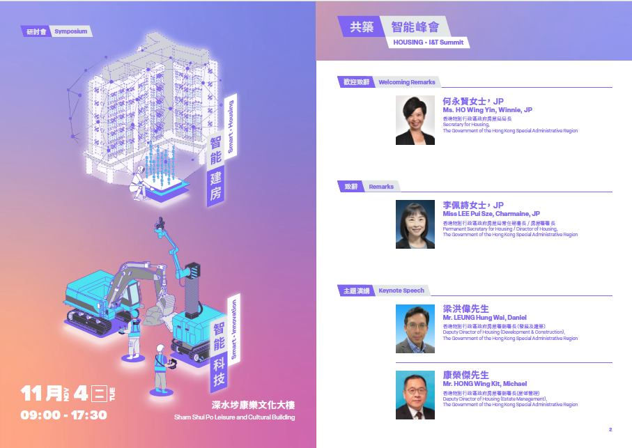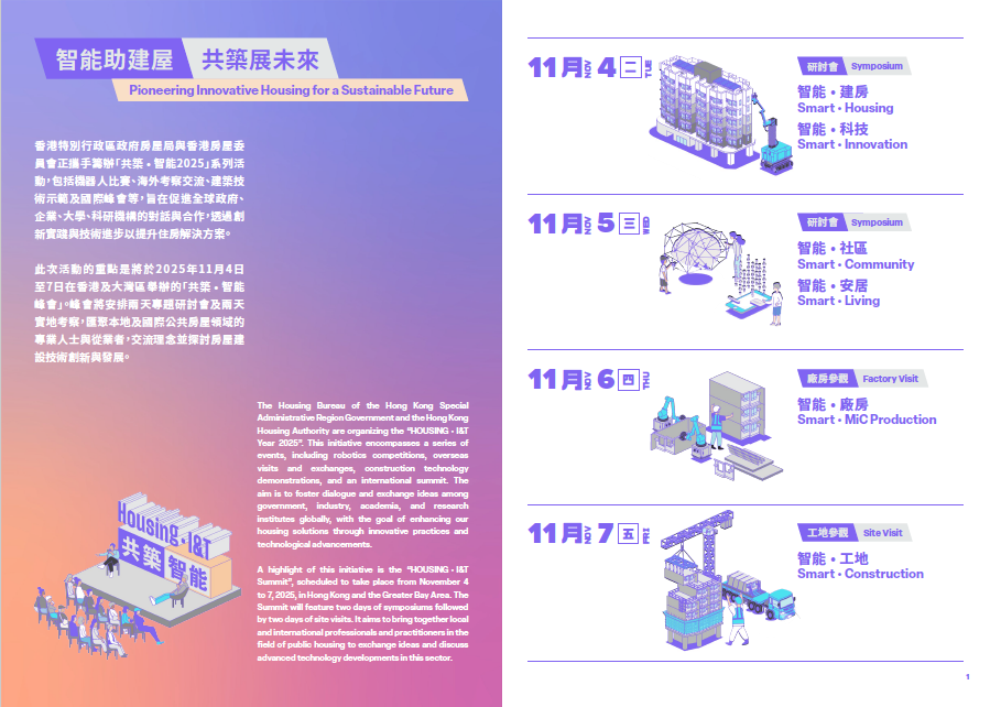 The HOUSING • I&T Summit, a key event of the “HOUSING • I&T Year 2025”, is scheduled for 4 to 7 November 2025 in Hong Kong. The Summit will feature two days of symposiums followed by two days of site visits. It aims to bring together local and international professionals and practitioners in the field of public housing to exchange ideas and discuss topics related to advance technology development in public housing.