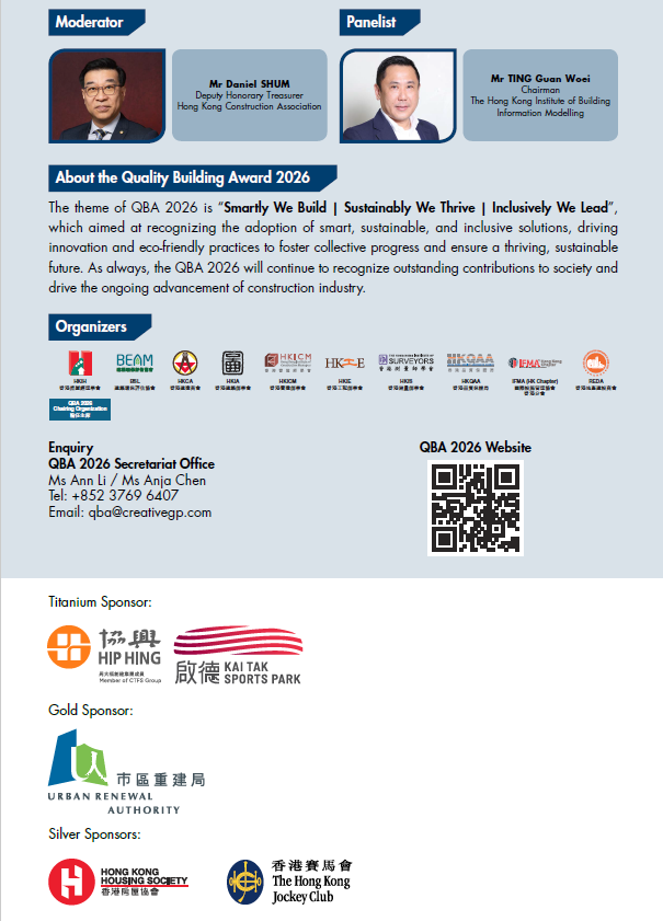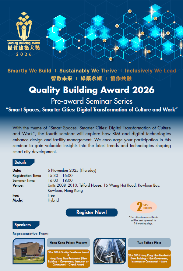The Quality Building Award (QBA) Pre-award Seminar series is coming to its final session. With the theme of “Smart Spaces, Smarter Cities: Digital Transformation of Culture and Work”, the fourth seminar will explore how BIM and digital technologies enhance design and facility management. We encourage your participation in this seminar to gain valuable insights into the latest trends and technologies shaping smart city development.