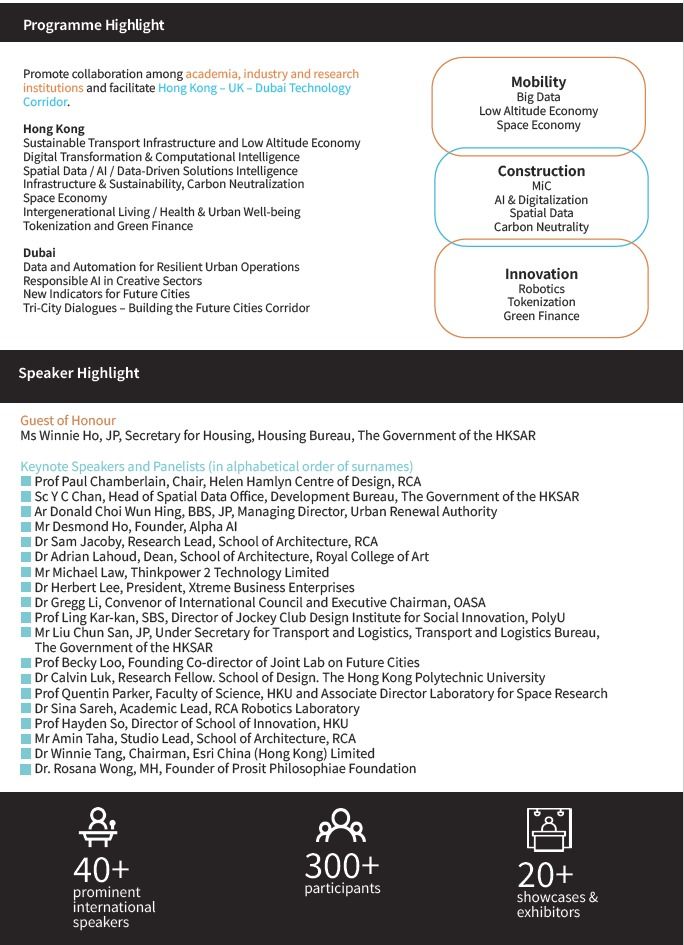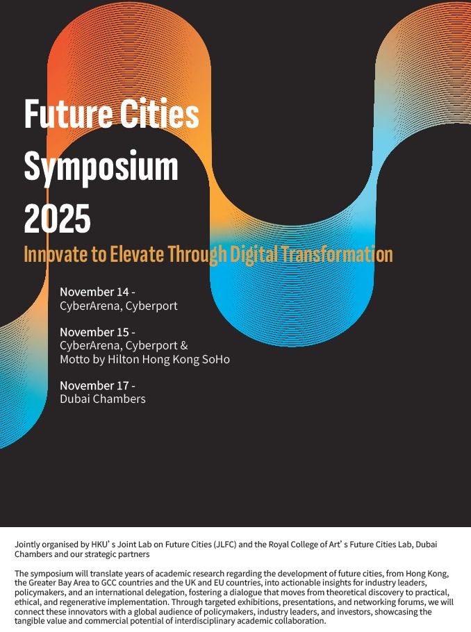 Under the theme "Innovate to Elevate Through Digital Transformation", this symposium represents a collaborative initiative between HKU’s Joint Lab on Future Cities, the Royal College of Art’s Future Cities Lab, Dubai Chambers, and our strategic partners by showcasing applied outcomes from the research in sustainable transportation & mobility, data-driven sustainable & resilient infrastructure, healthy cities & urban well-being, and speculative urban futures under computational intelligence & data science.