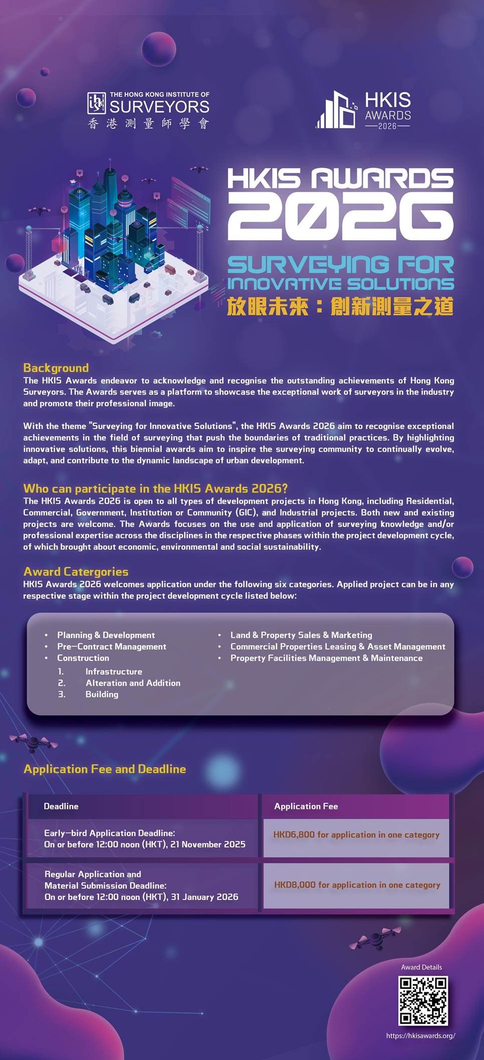 Riding on the success of the inaugural HKIS Awards 2024, this year the HKIS has transformed the Awards by including innovative elements and launched the HKIS Awards 2026, themed “Surveying for Innovative Solutions”.
