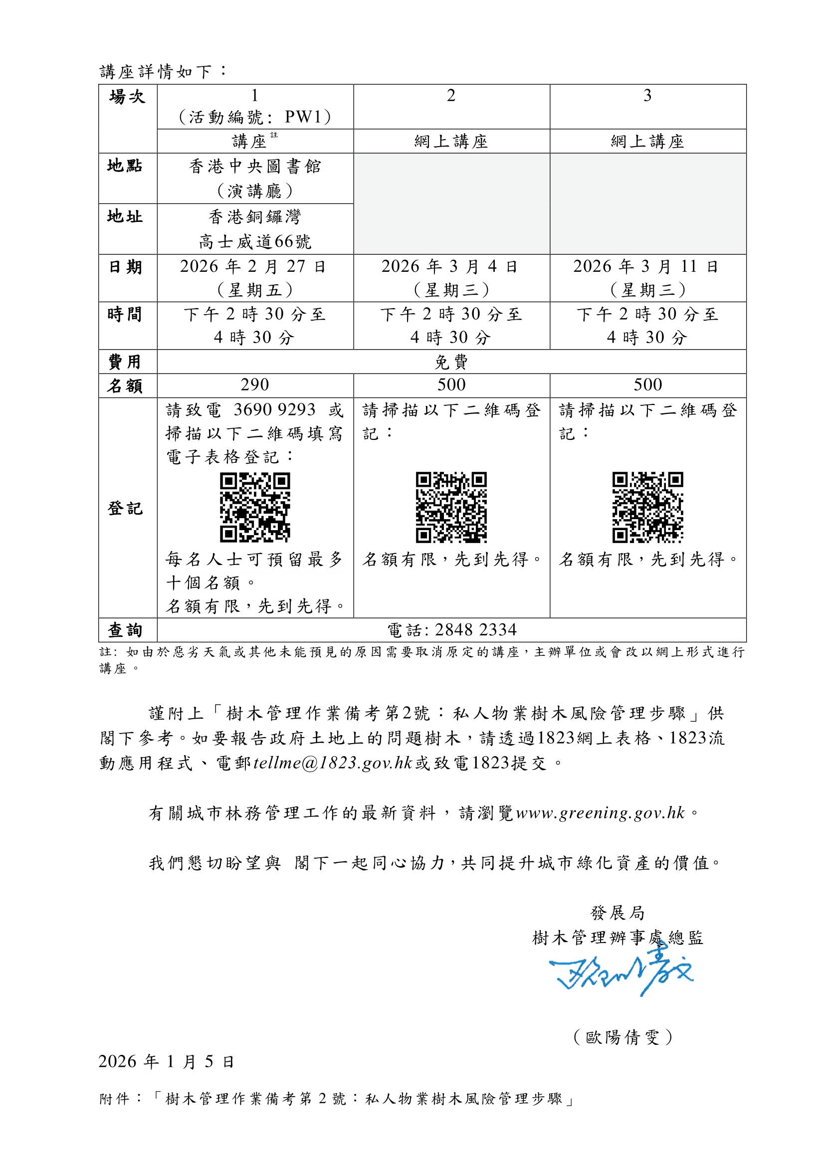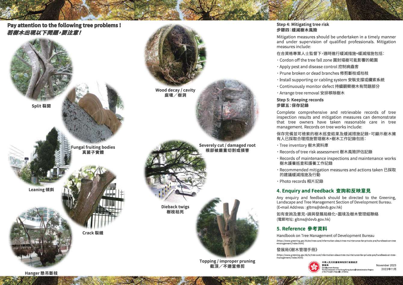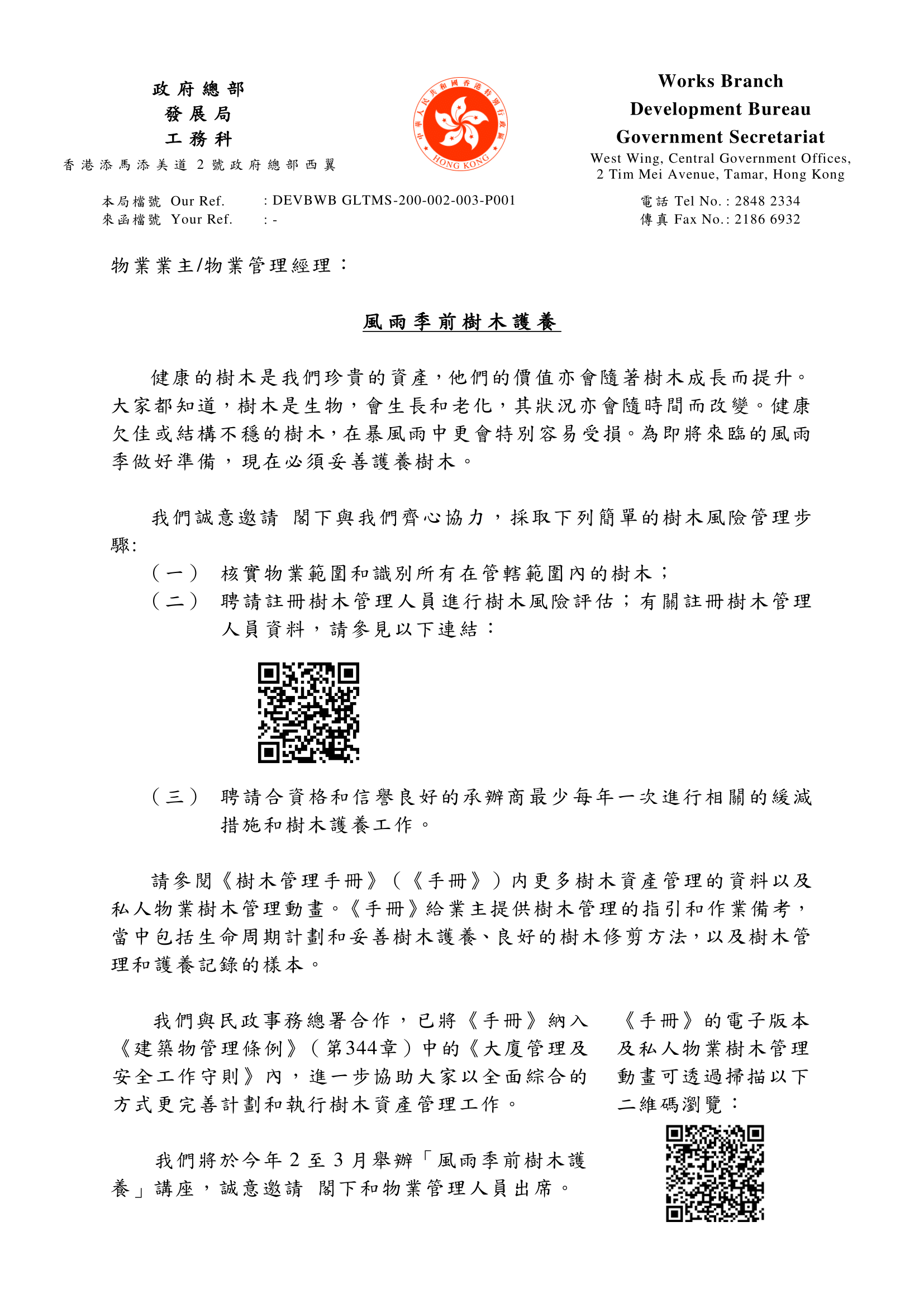 以下為"發展局-綠化、園境及樹木管理組"有關「風雨季前樹木護養」的信件及「樹木管理作業備考第2號:私人物業樹木風險管理步驟」,供閣下參閱和採取跟進工作。