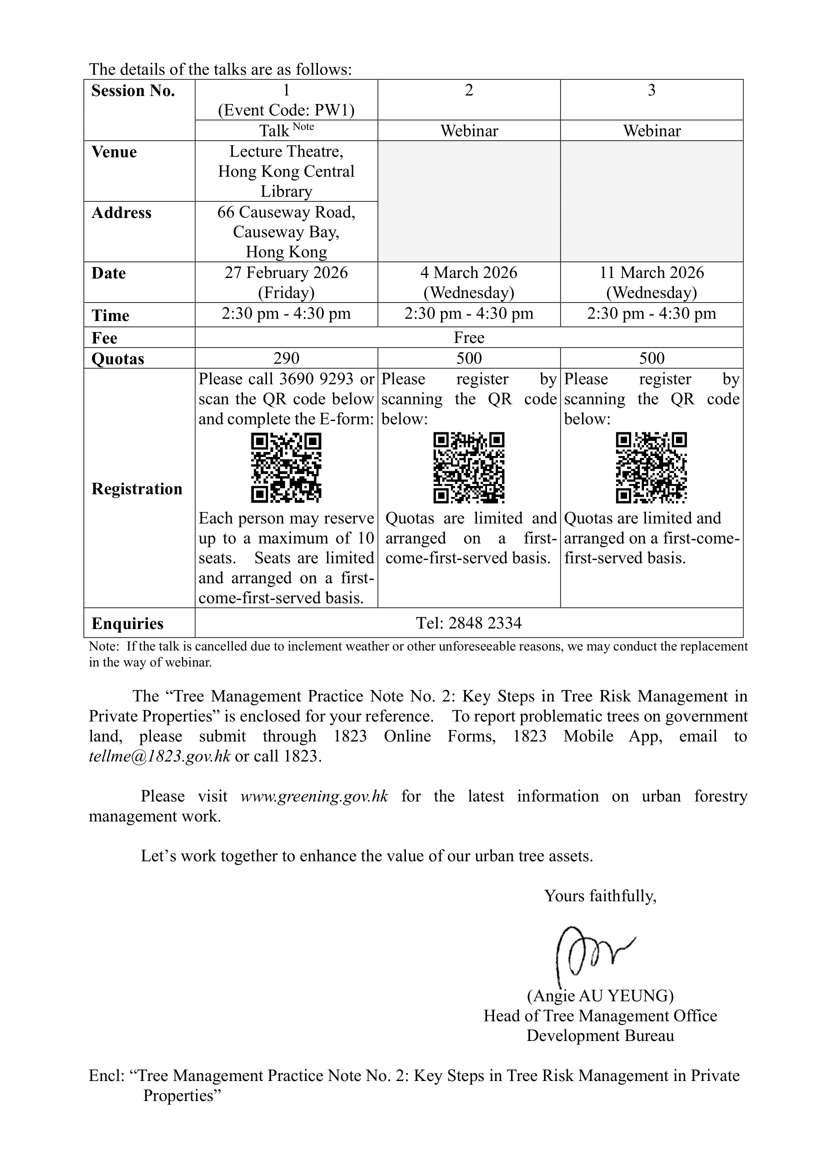 Below please find the letter titled "Tree Care before Wet Season" and the Tree Management Practice Note No. 2 “Key Steps in Tree Risk Management in Private Properties” from "Greening, Landscape and Tree Management Section, Development Bureau, for your reference.
