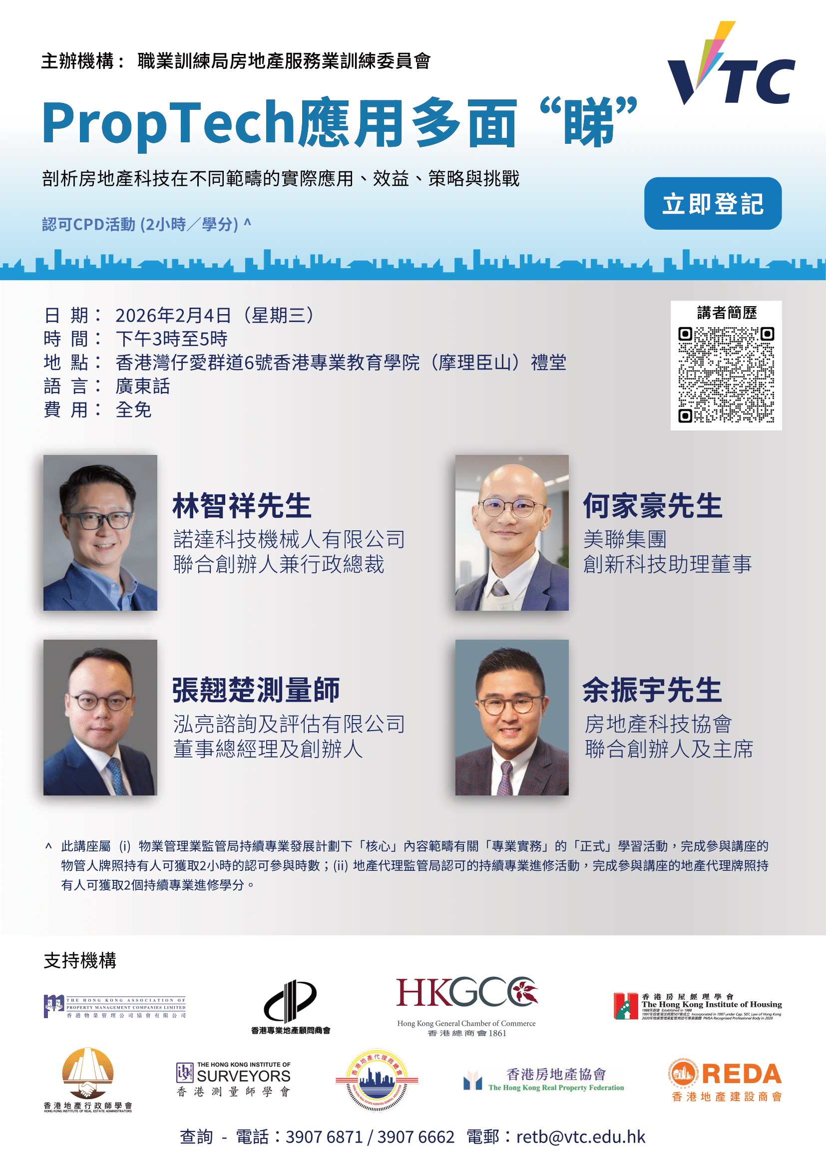 VTC Real Estate Services Training Board is organising a seminar namely “PropTech in Action” with details as below. If interested, please contact VTC, contact details as shown on the poster below, for more information.