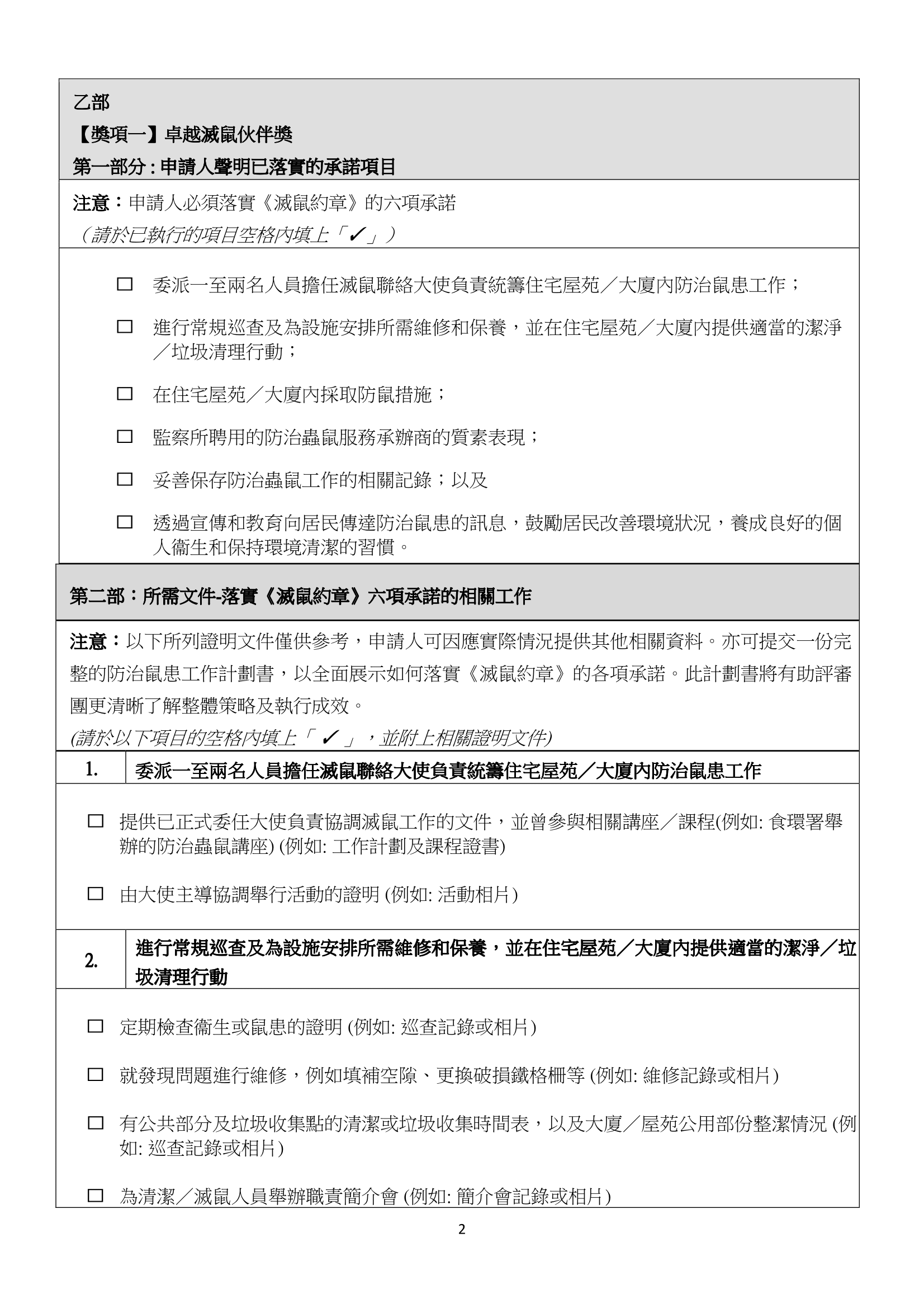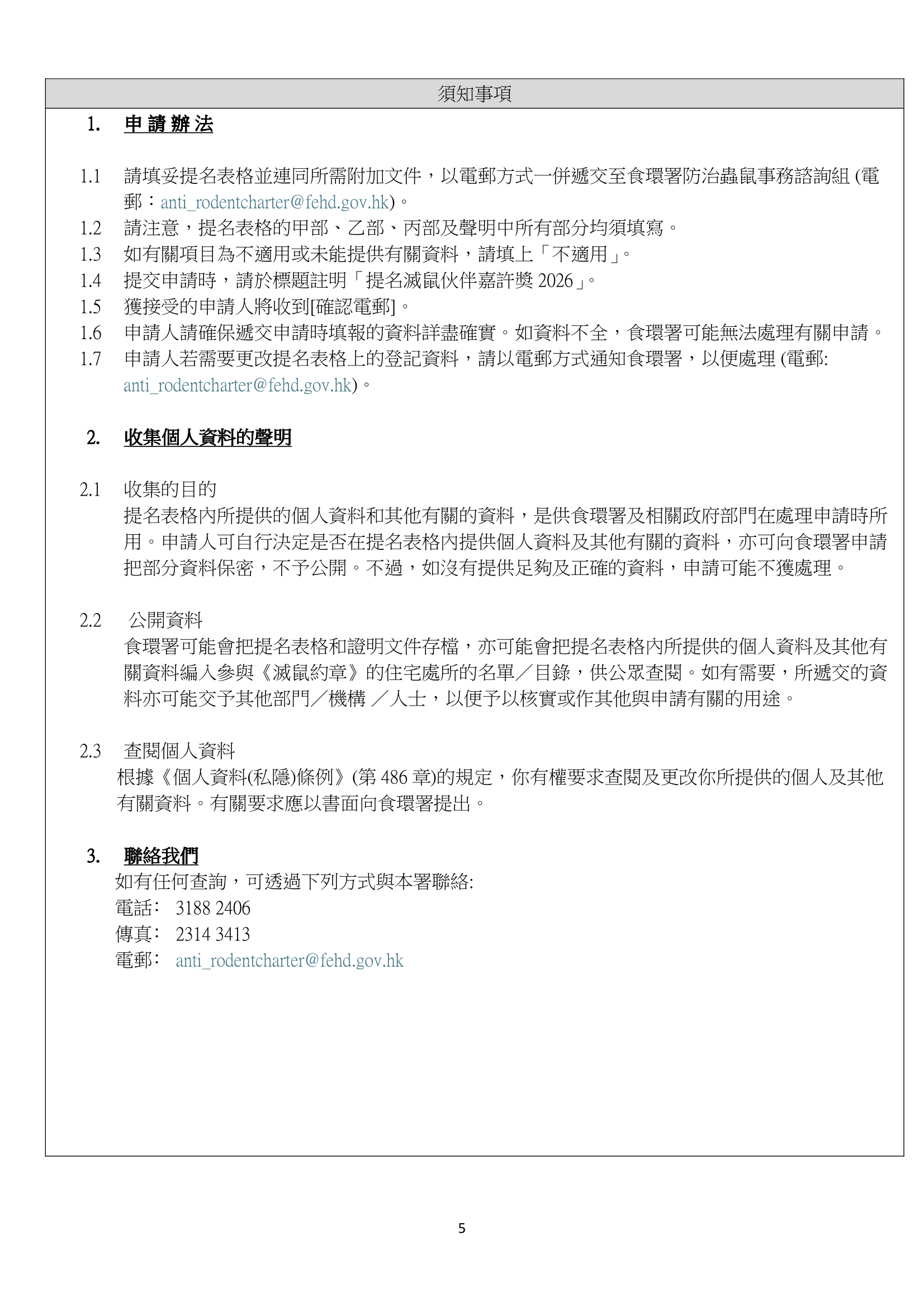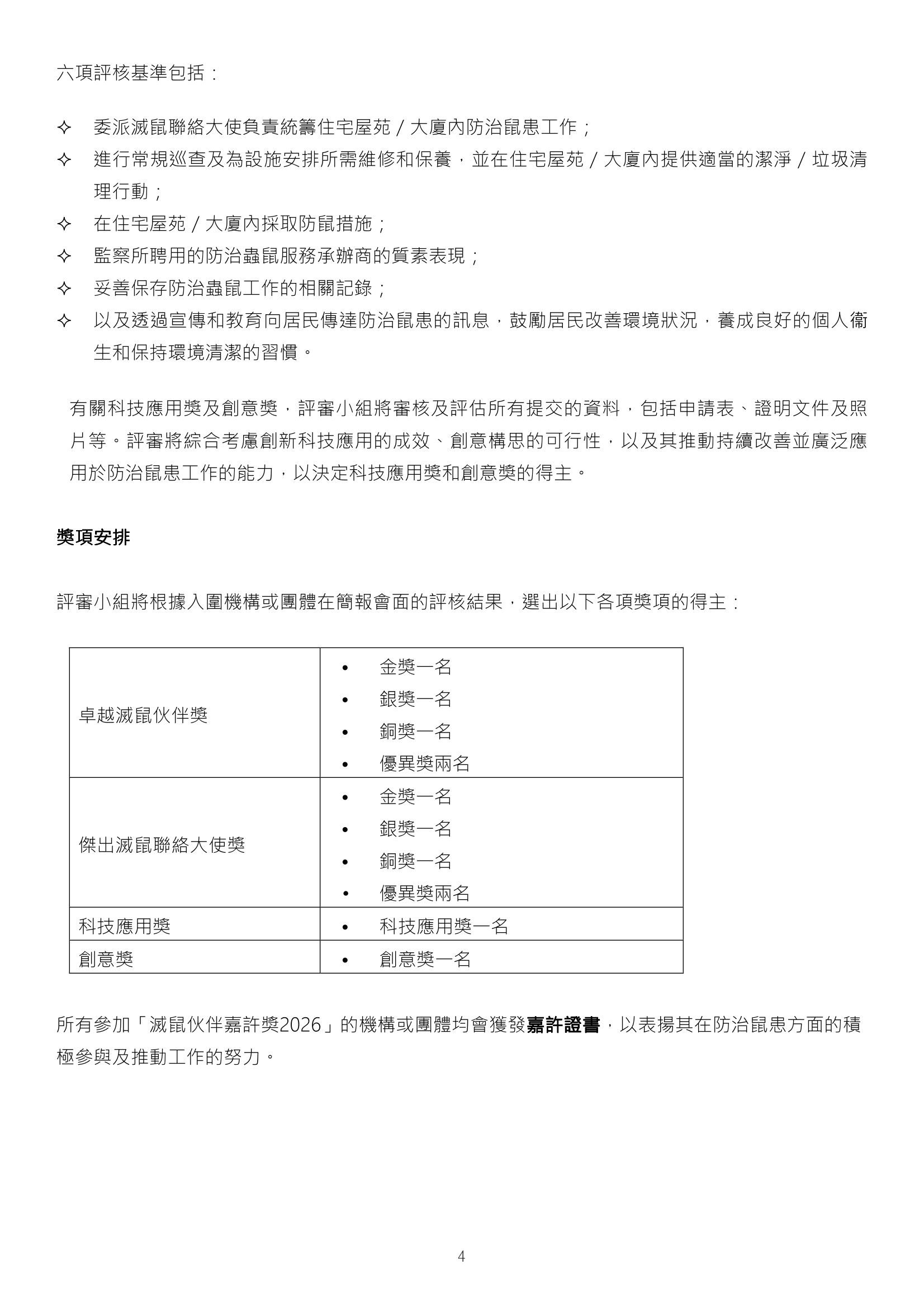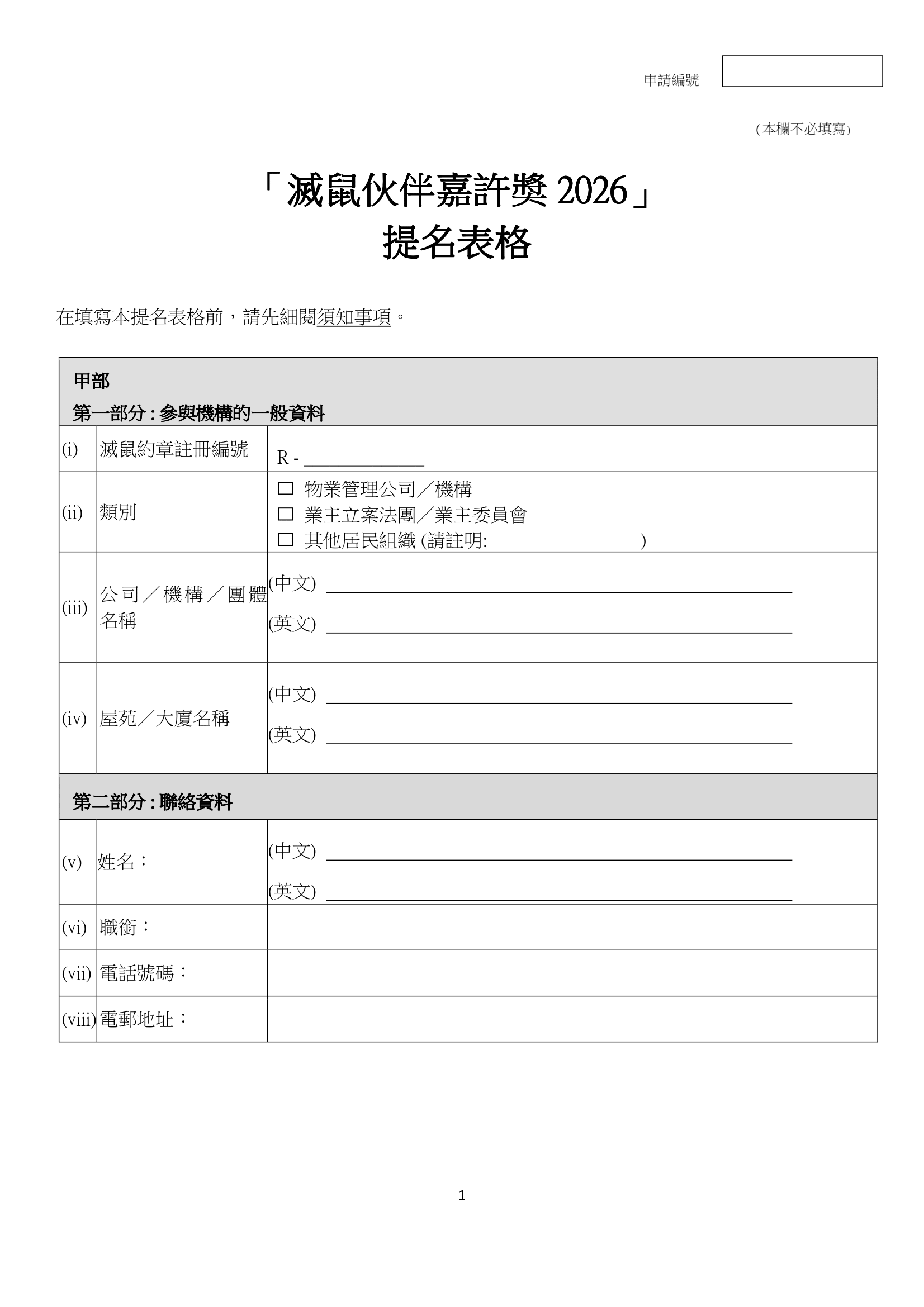 為表揚積極參與《滅鼠約章》的機構/公司/團體,鼓勵住宅處所建立長遠而有效的防鼠機制,提升居民對環境衞生的關注與參與度,並促進社區間的經驗交流與互動,食環署舉辦「滅鼠伙伴嘉許奬2026」,並即日起接受提名申請。所有已簽署《約章》的滅鼠伙伴均符合提名資格,有關活動詳情和申請方法,請參閱附件,或可瀏覽本署《滅鼠約章》專題網頁,網址如下: