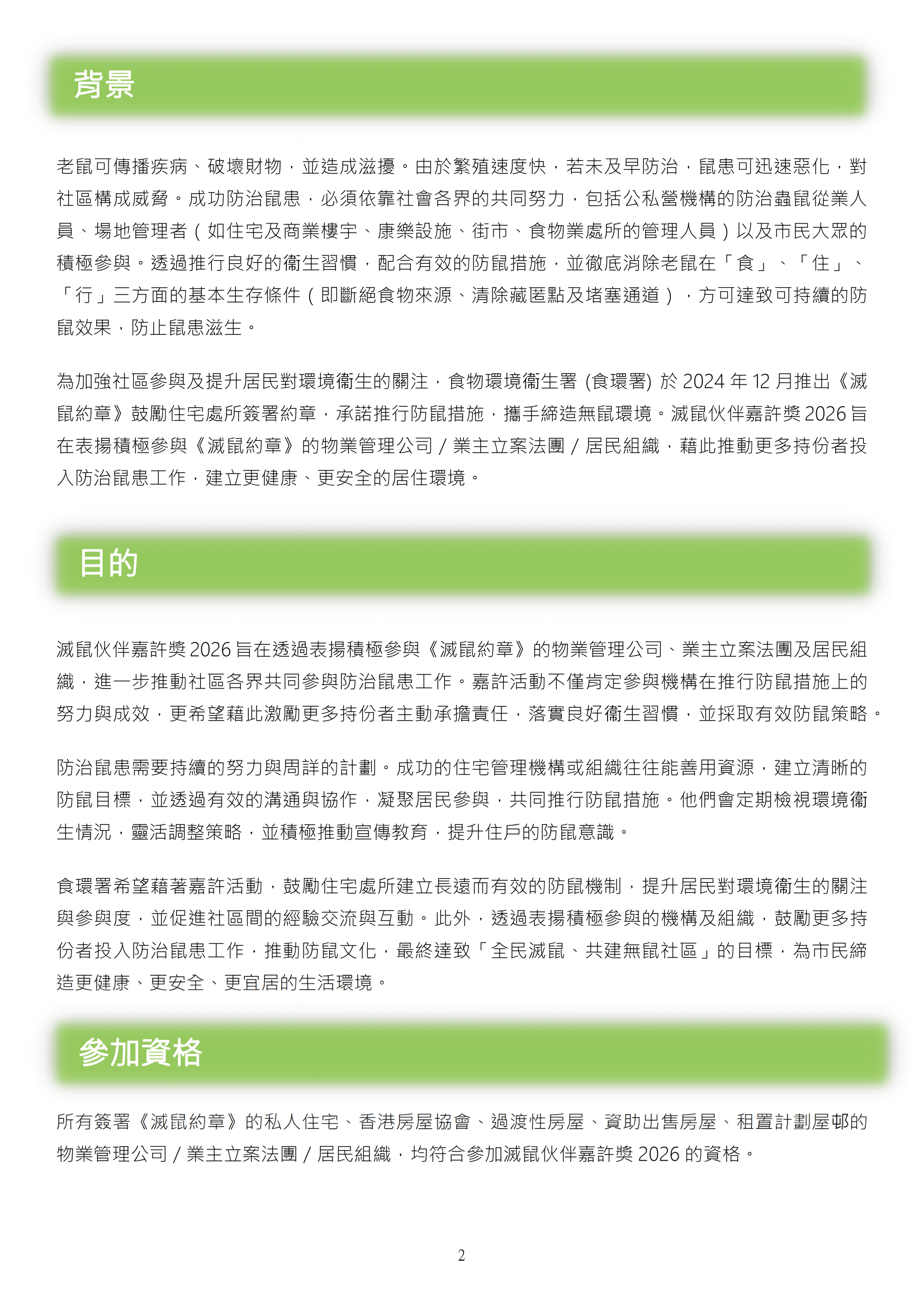 食物環境衞生署(食環署)現誠邀貴會協助推廣並鼓勵轄下會員及物業管理公司/機構/團體參與提名「滅鼠伙伴嘉許奬2026」。