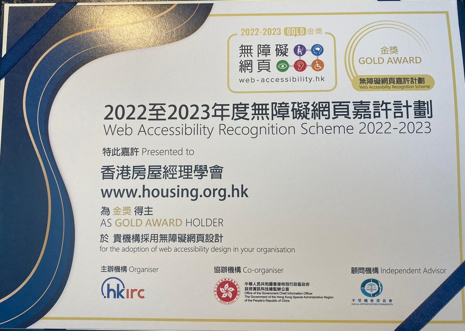 香港房屋經理學會獲得2022至2023年度無障礙網頁嘉許計劃-金獎,嘉許本會採用無障礙網頁設計